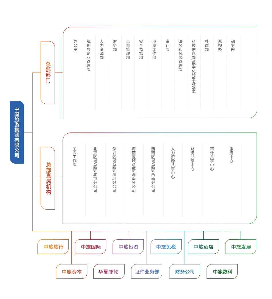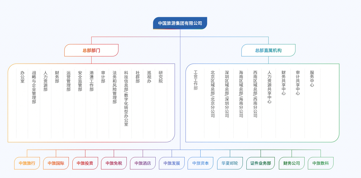 中國旅游集團(tuán)有限公司暨香港中旅(集團(tuán))有限公司是中央直接管理的國有重要骨干企業(yè),也是總部在香港的中央企業(yè)之一。集團(tuán)歷史可追溯到1923年8月15日上海商業(yè)儲(chǔ)蓄銀行設(shè)立的旅行部。經(jīng)過百余年的發(fā)展,集團(tuán)形成了由旅行社、景區(qū)、酒店、免稅、旅游交通、證件業(yè)務(wù)、郵輪、地產(chǎn)、文創(chuàng)以及在港綜合業(yè)務(wù)組成的產(chǎn)業(yè)布局,經(jīng)營網(wǎng)絡(luò)遍布內(nèi)地、港澳和海外超過30個(gè)國家和地區(qū)。集團(tuán)旗下匯聚了港中旅、國旅、中旅、中免等眾多知名旅游品牌,是我國唯一一家以旅游為主業(yè)的央企,也是目前我國發(fā)展歷史最長、產(chǎn)業(yè)鏈條較全、經(jīng)營規(guī)模較大、品牌價(jià)值較高的旅游龍頭企業(yè)。截至2025年底,集團(tuán)員工人數(shù)超過4.2萬人,集團(tuán)總資產(chǎn)超過2000億元,每年接待游客近9千萬人次。目前,集團(tuán)旅游主業(yè)的基本情況如下: