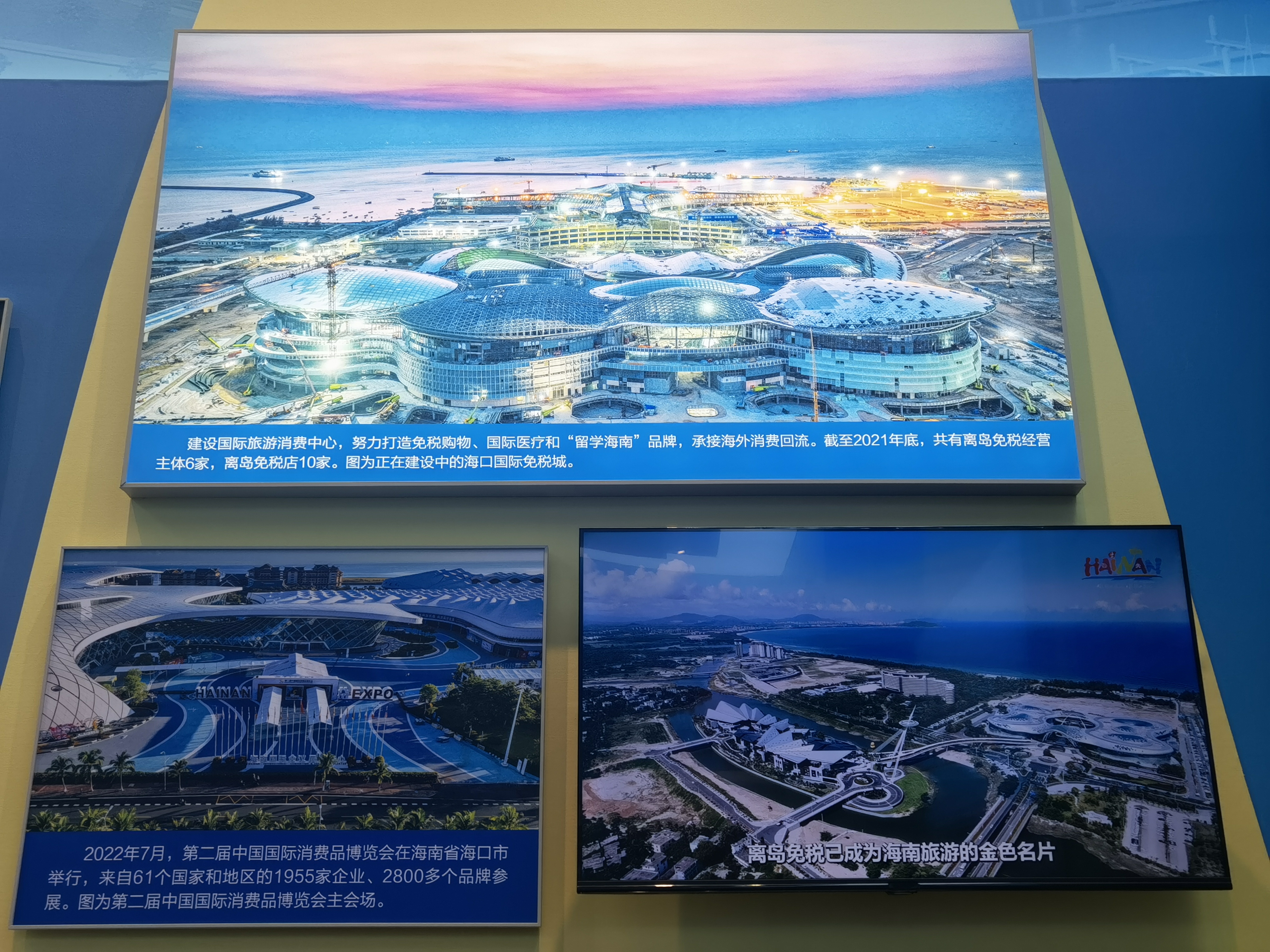 圖為主題成就展地方展區(qū)(海南)展示正在建設(shè)中的海口國(guó)際免稅城