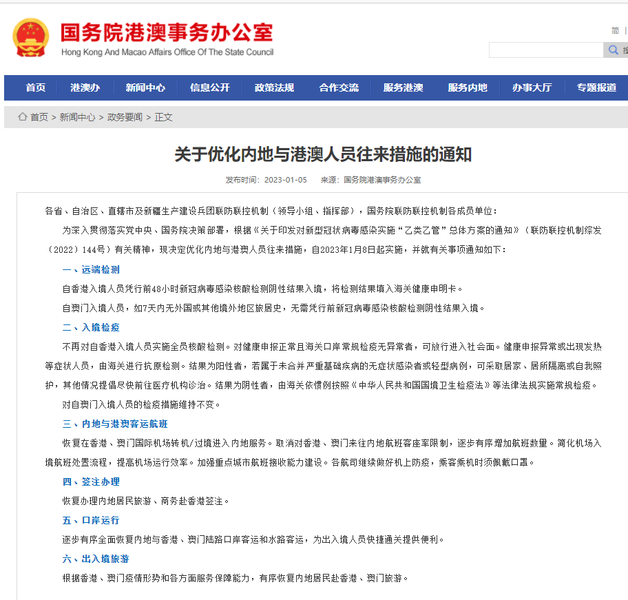 1月5日,國務院聯防聯控機制綜合組發布《關于優化內地與港澳人員往來措施的通知》,自香港入境人員憑行前48小時新冠病毒感染核酸檢測陰性結果入境,將檢測結果填入海關健康申明卡。