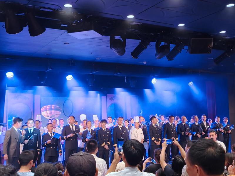 首航期間,“鼓浪嶼”號服務團隊展現高度的敬業精神與專業素養,在客房服務、餐飲服務及活動組織等環節中,始終保持熱情周到、細致入微,全力營造舒適安心的航行環境。在餐飲服務方面,為滿足不同乘客口味偏好,由經驗豐富的馬來西亞大廚團隊推出中西融合餐飲,自助餐廳分量充足、種類豐富。在互動體驗方面,為游客們準備豐富精彩的娛樂、購物等活動,安排八段錦、武術講座、非遺節目、沉浸式劇目體驗(滬上綺夢)、DIY手工玫瑰、酒吧駐唱、電影播放等,cdf郵輪免稅店煥新開業,推出多重促銷活動。在娛樂演藝方面,由國際頂尖娛樂團隊特別為“鼓浪嶼”號傾力打造的主秀《絲路傳奇》和《霓裳馬戲秀》,掀起了與游客互動的高潮,獲得廣大游客的贊譽和好評。此外,為減輕海上風浪造成的不適感,郵輪還為游客提供免費暈船藥和暈船貼,密切關注乘客需求,第一時間解決問題,受到客戶一致好評。