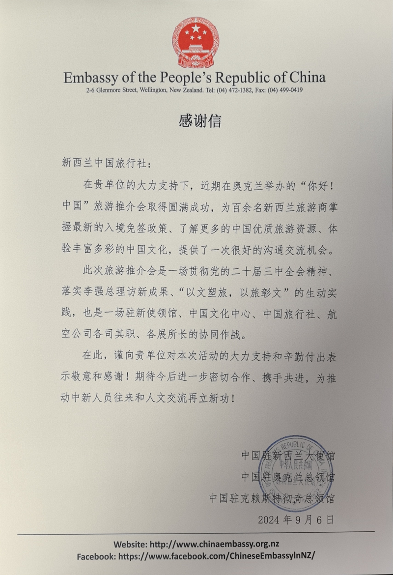 中旅旅行所屬新西蘭中旅收到中國駐新西蘭大使館等單位感謝信