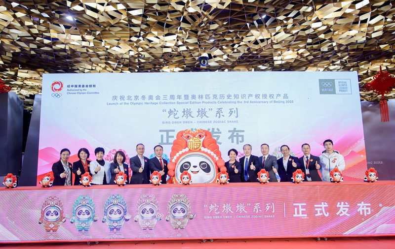 華江文化作為國際奧委會、中國奧委會授權的奧林匹克特許經營企業,現場發布了具有“五福臨門”寓意的五類“蛇墩墩”產品。為多維展現“蛇墩墩”形象,華江文化還設計了毛絨、擺件、徽章、冰箱貼等多種周邊產品。“冰墩墩”蛇年新春特別版系列新品將于11月22日在北京、上海、天津、重慶、廣州五市率先發售,12月將陸續上市全國各大城市。