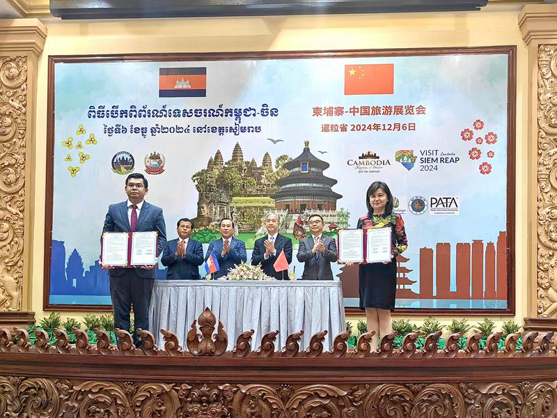 為深入貫徹落實習近平總書記提出的“同柬方攜手打造高質量、高水平、高標準的新時代中柬命運共同體”重要講話精神,助力中柬人文交流和旅游合作,在近期集團董事長王海民與中國駐柬埔寨大使汪文斌視頻會談后,12月6日,在柬埔寨暹粒開幕的中柬旅游展覽會期間,集團與柬埔寨旅游部簽署了旅游合作備忘錄。在中國駐柬埔寨大使汪文斌、柬埔寨旅游大臣胡海、暹粒省副省長歐興加、集團副總經理簡易的見證下,中旅旅行董事長鄭麗娟和柬埔寨旅游部代表簽署合作備忘錄。