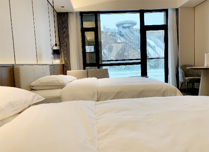 酒店位于古楊樹場館群內,近鄰國家跳臺滑雪中心和國家越野滑雪中心。部分客房的窗外,能夠看到“雪如意”鑲嵌于山間,更能欣賞到夜色下“雪如意”的星光璀璨。冬奧會開幕時,這里將與南側的雪如意維景酒店共同迎來雪上項目的技術官員團隊,因此,酒店的工作團隊,正以與冬奧項目服務團隊同樣的快節奏、高標準來推進各項工作。據悉,為做好本次測試賽服務,酒店團隊從酒店籌開、到測試賽服務籌備,迅速集結、快速整合,形成了一支全新的中旅服務勁旅,成為了“冰玉環”邊一道亮麗而溫馨的風景。