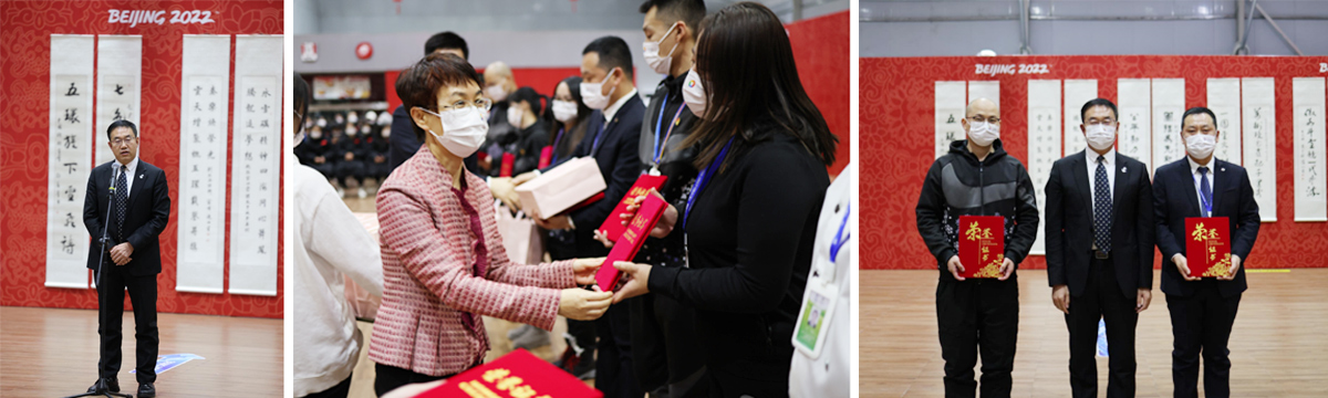 活動現場,賈凱副部長發表了熱情洋溢的講話,他從參與中旅酒店誓師大會開始憶往昔,到憧憬冬奧會服務現場盛況來勵征程。他表示,服務這樣一場國際賽事大家要感到榮幸和自豪,要勇于擔當和奉獻,在學習中得到成長,堅定信心履職盡責,以“冬奧盛會必定有我,精彩冬奧成就大我,服務奧運我將無我”的決戰姿態迎接冬奧會開幕。中旅酒店黨委委員、副總經理、冬奧會項目前方總指揮陳月亮轉達了集團領導對現場團隊的新年祝福。晚會前舉行了簡短的表彰儀式,對2021年4月誓師會以來表現較好的員工給予表彰,用榜樣的力量來感染人、鼓舞人,倡導大家人人爭做榜樣、爭做先鋒。簡短的頒獎活動過后,跨年元旦晚會正式拉開帷幕。