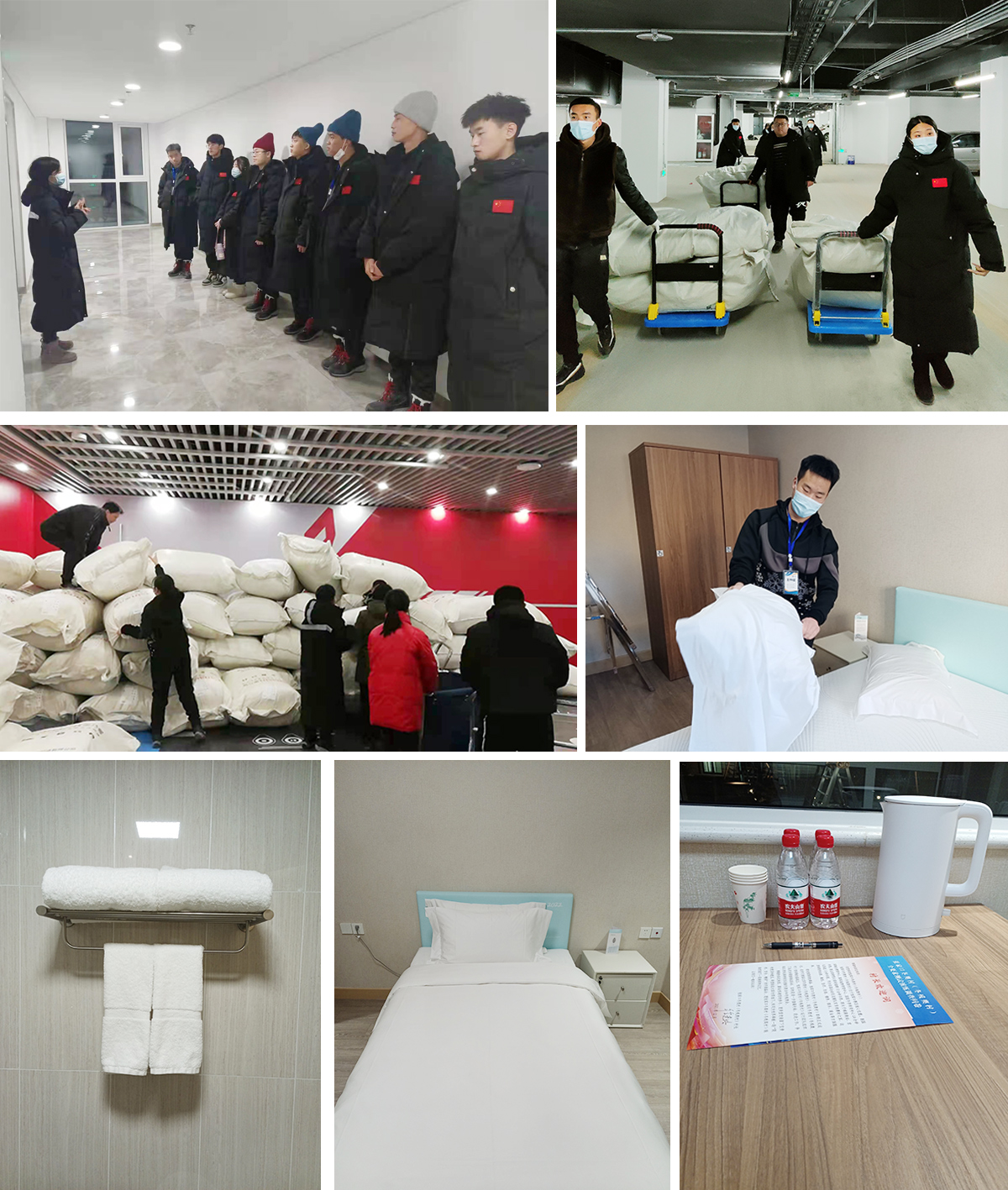 在冬奧村工作的兩個多月,讓我深深體會到了合作和堅持的重要性。由于前期一些工程的原因,我們只有3天時間準備全要素壓力測,人手緊張,任務非常艱巨。集團所屬的各個酒店集結了30來個骨干專門進村支援我們,平時都是酒店做房的熟手,到村里以后專攻鋪床,他們攬下了做房工作中技術含量最高的任務,我們就集中精力做好物資移入和房間布置工作。正是大家的通力合作,才能在這么短的時間內,把一張張床、一間間房準備出來。