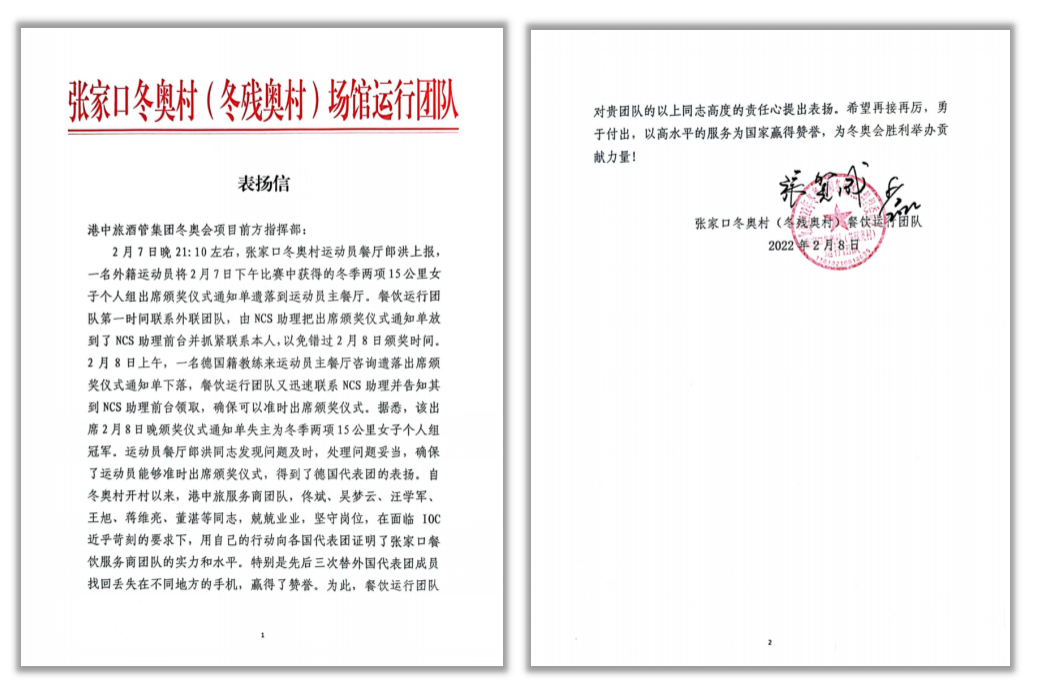 2月8日,北京奧組委張家口冬奧村運(yùn)行團(tuán)隊(duì)向中旅服務(wù)團(tuán)隊(duì)專致感謝信,這也是團(tuán)隊(duì)收到的第二封紅頭感謝信。