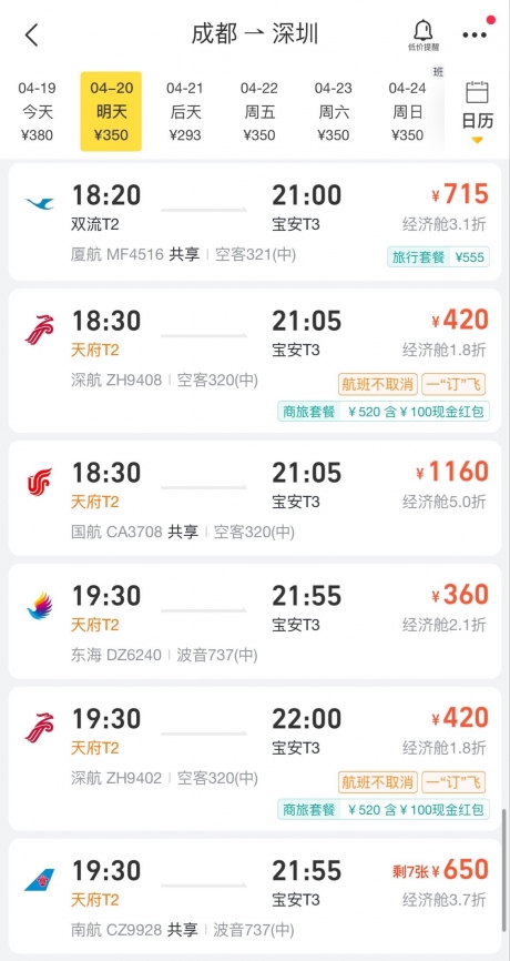 (圖:飛豬App上可預訂深圳航空、四川航空“一訂飛”“訂就飛”航班)