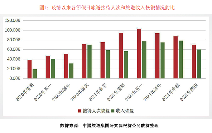 國內旅游呈現先高后低、跌宕起伏的復蘇特征。受益于疫情的有效控制,國內旅游在全球率先復蘇,但2021年下半年以來,受疫情多點散發、跨省游熔斷「常態化」等影響,復蘇速度有所減慢。根據中國旅游研究院最新預測數據,2021年國內旅游接待人數恢復到2019 年的57%,國內旅游收入恢復到2019年的53%,顯著低于其對2021年上半年的預測數據。中國旅游研究院此前預測數據顯示,2021上半年國內旅游接待人次恢復到疫情前的7成左右。節假日出行市場先行復蘇。2021年春節、清明、五一、十一等節假日國內旅游人數分別恢復到疫情前同期的75.3%、94.5%、103.2%和70.1%,國內旅游收入恢復到疫情前同期的58.6%、56.7%、77.0%和59.9%,好于年度恢復情況。主要客源地恢復優于主要目的地。靠近主要客源市場的旅游景區客流增長趨勢明顯,而面向中遠程旅游市場的自然資源和歷史文化資源型旅游景區接待人次和綜合旅游收入下降明顯。中國旅游研究院專項調查數據顯示,游客目的地平均游憩半徑從2020年的14.2公里收縮到2021年的13.1公里。