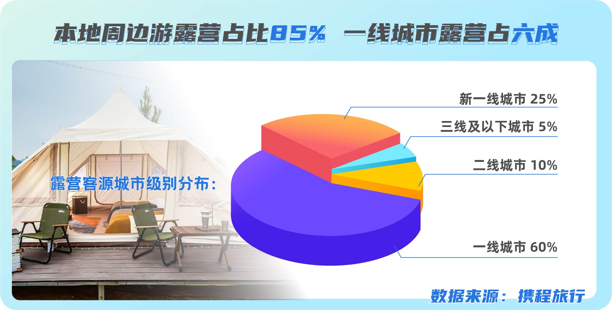 用戶對于露營地的評價也是影響露營地評分的重要指標。從客源地角度來看,攜程數據顯示,一線城市的露營用戶占比高達60%,新一線用戶占比25%,二線、三線及以下城市用戶占比分別為10%及5%。目前露營旅行的周邊游趨勢非常明顯,攜程平臺上報名本地+周邊露營產品的比例達85%,本地占比達50%以上。