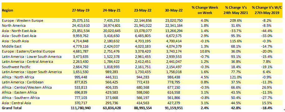 本周全球航空運力再次突破9000萬個座位數,達到9120萬。比上周增加了2.4%,新增了210萬個座位,這也是疫情以來單周最高的運力值。這周運力增長明顯的地區包括歐洲,該地區增長占據整體增量的一半以上,體現該地區休閑游需求的復蘇,今年夏季需求將充分恢復。