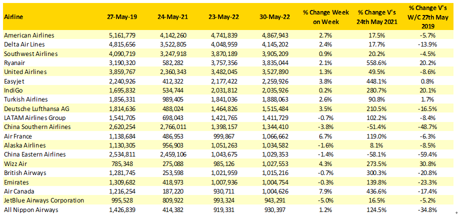 航司運力Top 10名單本周沒有變化,而第11-20位的排名則有所變化。Wizz航空從第18名上升到了第15名,對比2019年同期增加了近三分之一的運力。