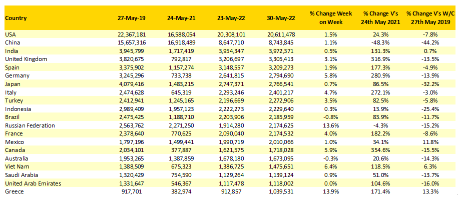 同比增長最快的是希臘,也正因此,希臘本周才得以躋身Top 20之列,將哥倫比亞擠出排行榜。本周希臘運力環比增長13.9%,比疫情之前的水平高出13.3%。這對于希臘及其烏佐酒生產商而言是好事,因為這意味著有更多的游客將到訪希臘,哪怕機場要排起長龍。