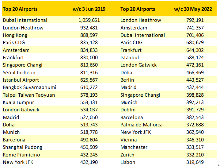 隨著西歐市場繼續強勢復蘇,國際機場的排行榜也變得頗具看點。目前全球Top 20的國際機場排行榜仍然由歐洲樞紐機場壟斷,西歐機場占據了16個席位。而值得關注的榜單缺席者包括有中國香港及臺北、韓國仁川、泰國曼谷、馬來西亞吉隆坡等機場,而新加坡機場已經回歸Top 20之列,排在第11名,不過新加坡機場也只是恢復了2019年同期一半的運力。倫敦希思羅機場本周拔得頭籌,阿姆斯特丹緊隨其后。