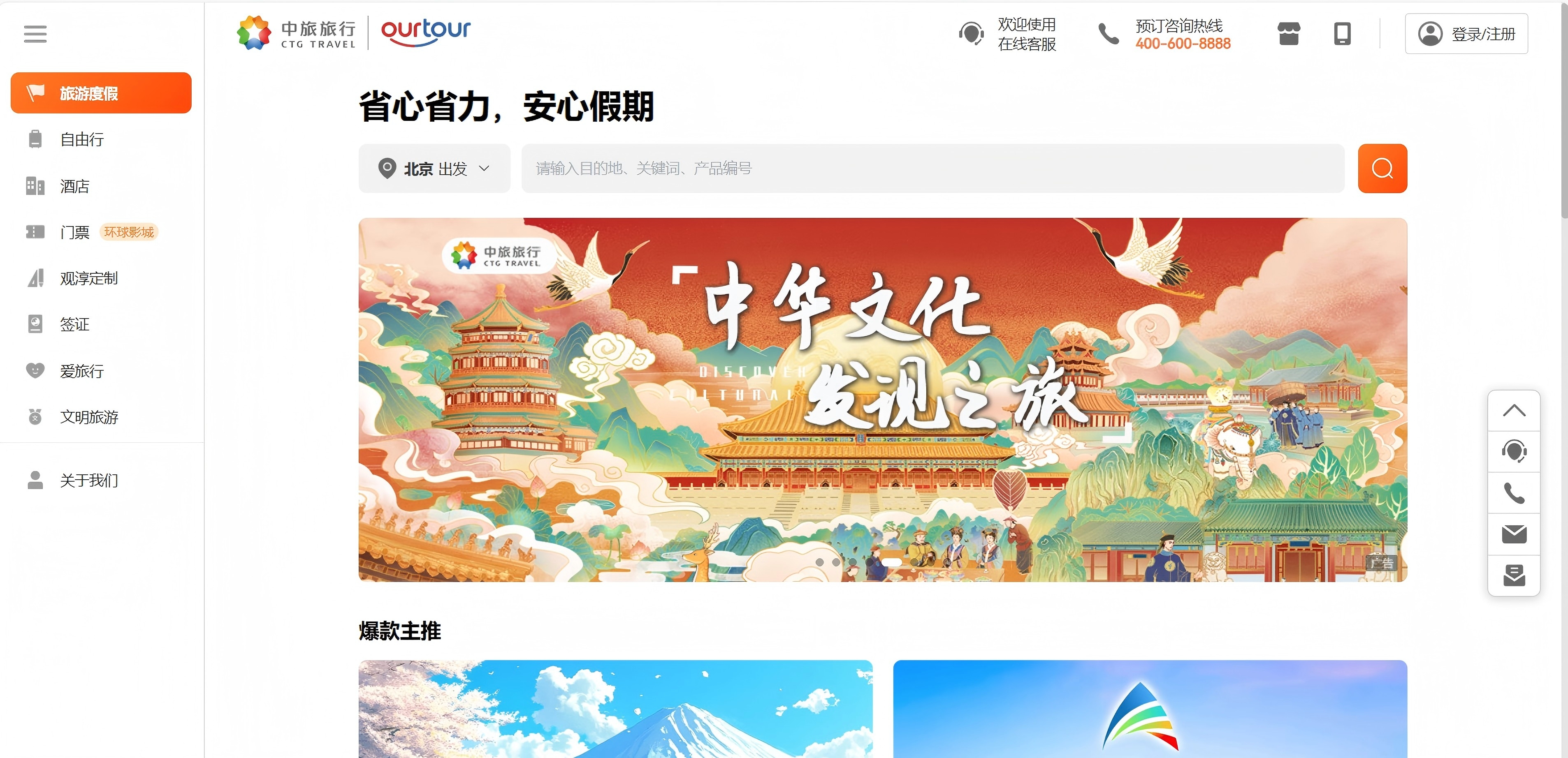 “中旅旅行”線上銷售平臺包括PC網(www.ourtour.com)、App和小程序,提供國內及出境跟團游、自由行、定制游、郵輪、機票、酒店、簽證等旅游產品一站式服務。“中旅旅行”將中旅、國旅、港中旅三大品牌的優質旅游資源進行整合,進行統一的展現和銷售;整合集團內維景酒店、星旅郵輪、景區、旅游金融等優質資源,升級具有核心競爭力的自有產品體系,滿足消費者的美好出行需求。